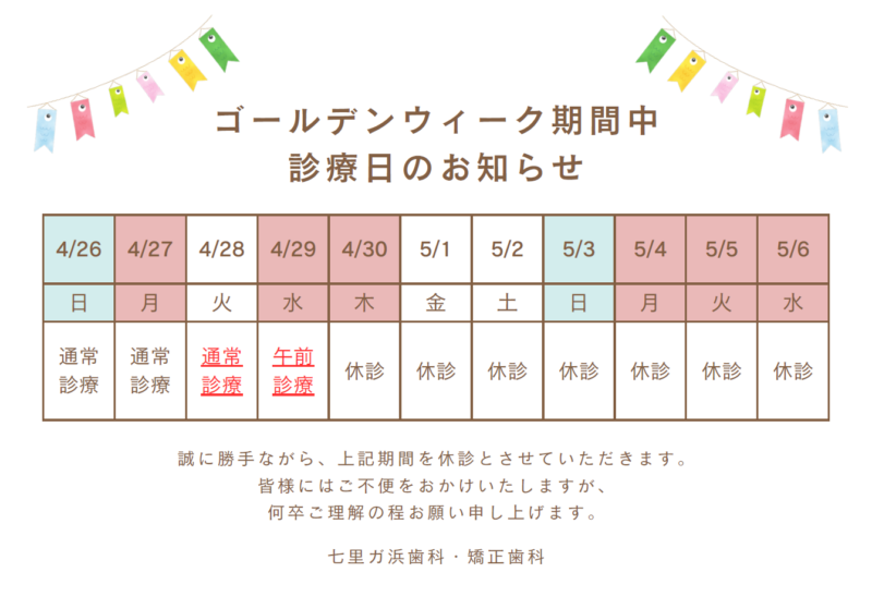 4月30日(木)から5月6日(水)まで休診いたします。